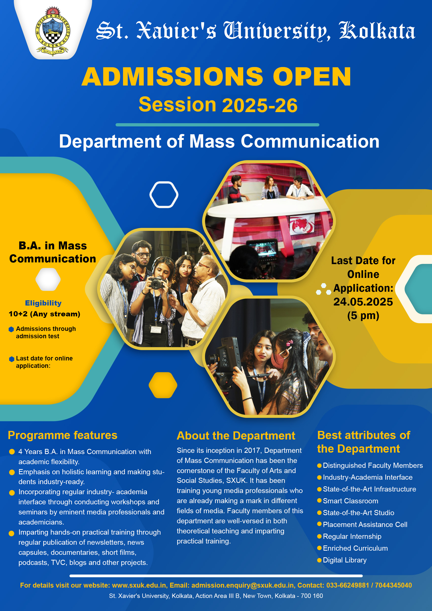 One of the vibrant departments of St. Xavier's University, Kolkata starting in 2017, the Department of Mass Communication is the cornerstone of the Faculty of Arts and Social Studies. The department offers four-year (eight semesters) BA (Hons.) programme in Mass Communication in accordance with NEP 2020 and SEP 2023 and two-year (four semesters) MA programme in Mass Communication with two specializations (Marketing Communication and Digital Video Production). The department also started the Ph.D programme in 2019.