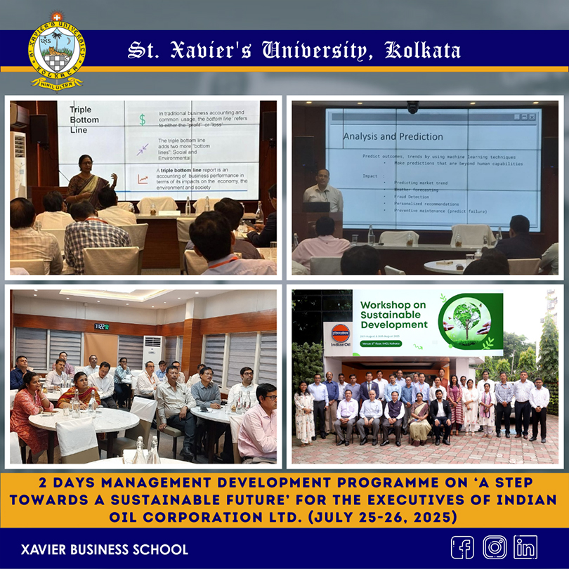 The two-day Management Development Programme (MDP) on “A Step Towards a Sustainable Future” was jointly organized by Indian Oil Corporation Limited (IOCL) and Xavier Business School, St. Xavier’s University, Kolkata, on 25–26 July 2025. The programme focused on sustainability, climate change, ESG, technology, and sustainable business practices. Through interactive sessions, case discussions, and expert insights, participants gained practical knowledge on integrating sustainability into corporate strategies. The programme witnessed active participation from IOCL executives and strengthened industry–academia collaboration. Overall, the MDP successfully enhanced understanding of sustainable development and its strategic importance in the energy sector.
