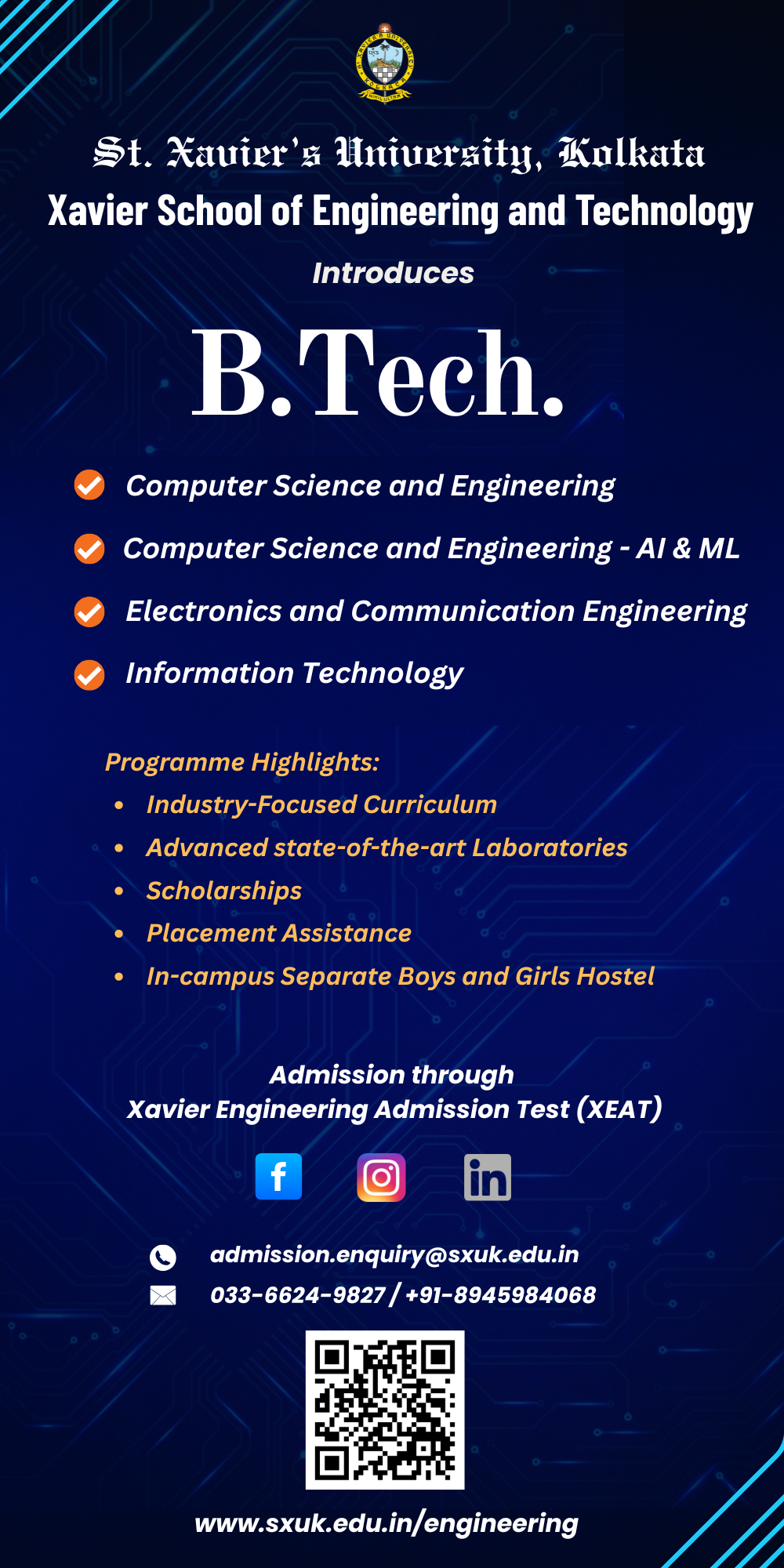 The St. Xavier’s University, Kolkata is set to begin its B.Tech. programmes from the academic session July 2026 under Xavier School of Engineering and Technology, marking a significant step in its commitment to quality technical education and innovation. Established with a vision to nurture future-ready engineers, the School will offer a strong academic foundation combined with hands-on learning, modern laboratories, and industry-oriented curricula. Emphasizing critical thinking, ethical practice, research, and technological advancement, the School aims to prepare students to meet emerging global and societal challenges while contributing meaningfully to sustainable development and national growth.