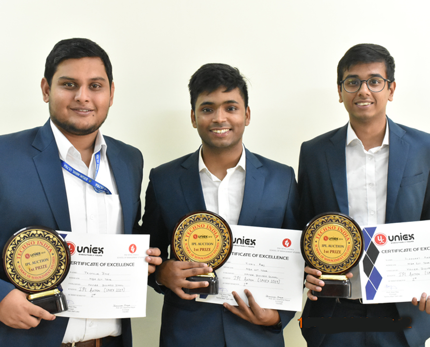 Prionkur Bose, Vinay Rai and Siddhant Ameria of MBA 1st Year (2018-20) have secured 1st position in the event IPL Auction organized by Techno India School of Management, Kolkata in March 2019.