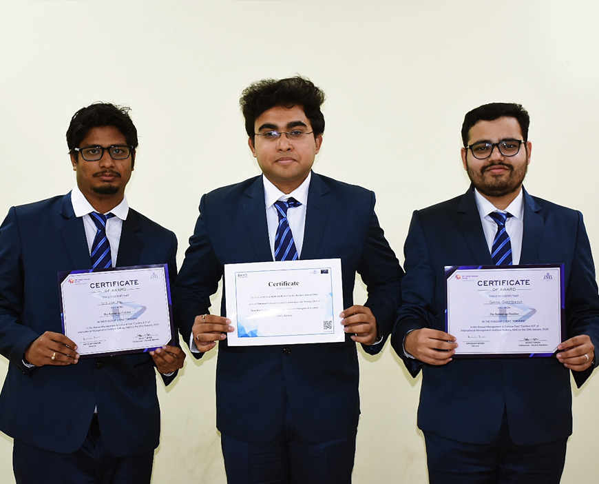 Allen DโCosta, Subhrajit Paul and Joel Lawrence of MBA 1st Year (2019-21 Batch) have secured 2nd position in the event Rann Kaushal (Business Strategy Making) at CONFERO 8.0 organized by International Management Institute (IMI), Kolkata on 10th January 2020.