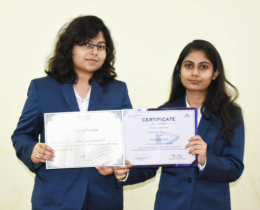 Smita Chatterjee and Deblina Pal of MBA 1st Year (2019-21 Batch) have secured 2nd position in the event FINVERSE (Stock Trading) at CONFERO 8.0 organized by International Management Institute (IMI), Kolkata on 10th January 2020.