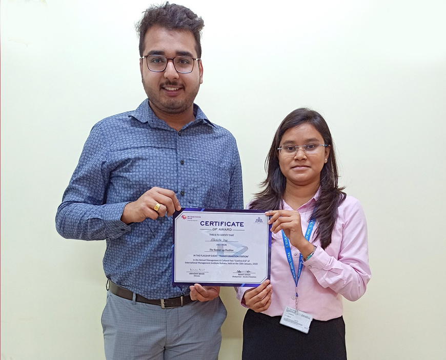 Tamoghna Dutta and Sinchita Das of MBA 2nd Year (2018-20 Batch) have secured 2nd position in the event BEST OUT OF WASTE at CONFERO 8.0 organized by International Management Institute (IMI), Kolkata on 10th January 2020.