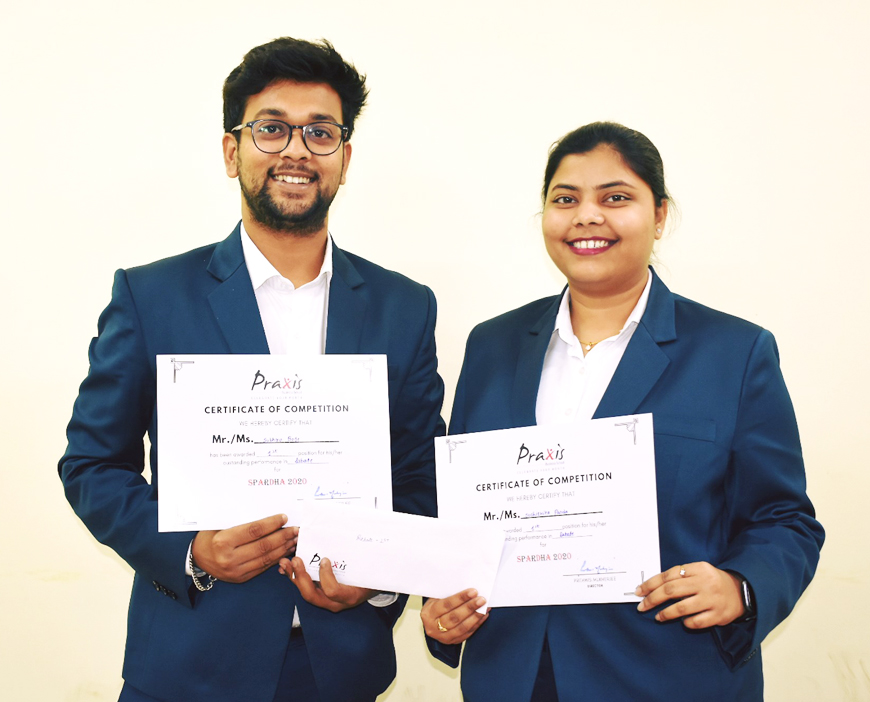 Subhro Bose and Suchismita Panda of MBA 1st Year (2019-21 Batch) have secured 1st position in the event THOUGHTFUL ARGUMENTS (Debate) at SPARDHA 2020 organized by Praxis Business School, Kolkata on 18th January, 2020.