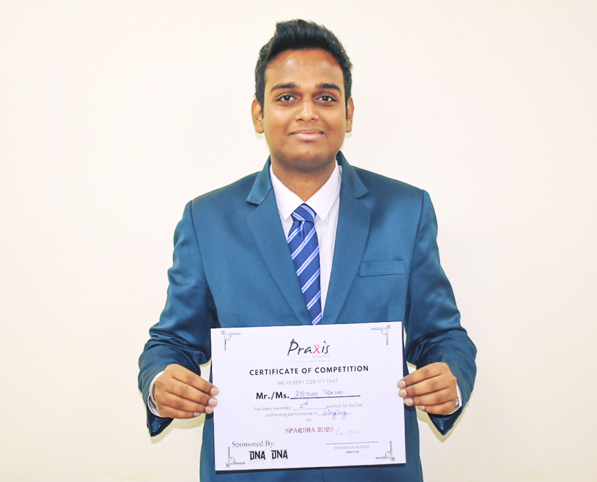 Ajitesh Prasad of MBA 1st Year (2019-21 Batch) has secured 2nd position in the event PITCH PERFECT (Solo Singing) at SPARDHA 2020 organized by Praxis Business School, Kolkata on 18th January, 2020.