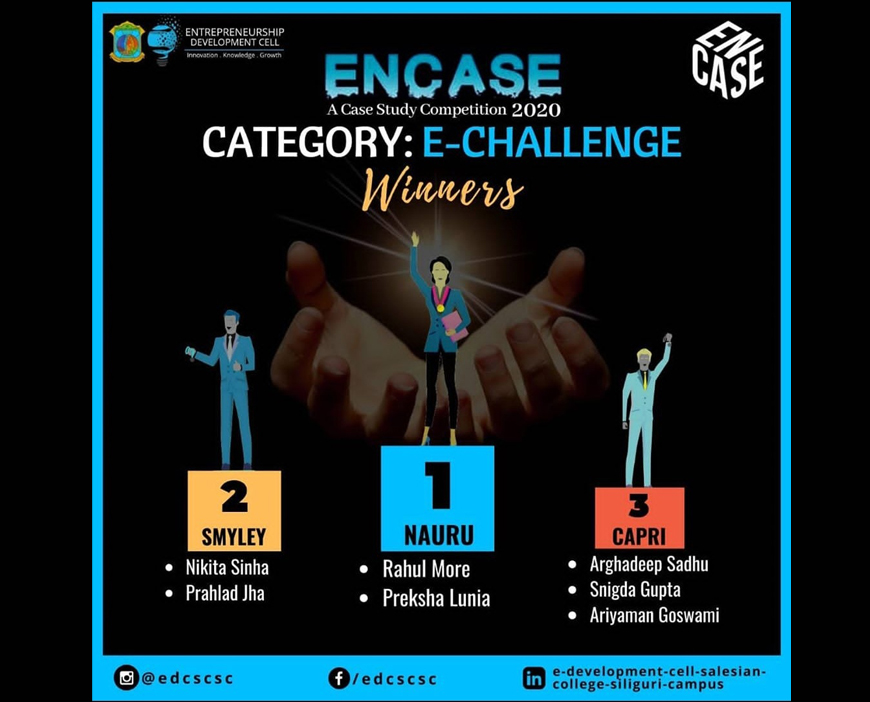 Rahul More and Preksha Lunia of MBA 1st Year (2019-21 Batch) have secured 1st position in the event ENCASE (Entrepreneurship Challenge) organized by Salesian College on 6th April, 2020.