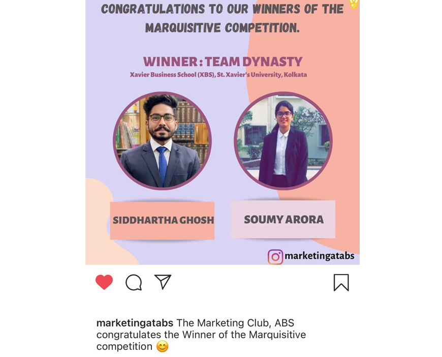 Siddhartha Ghosh & Soumy Arora of MBA 2nd Year (2019-21 Batch) have secured 1st position in the event MARQUISITIVE (Marketing) organized by Amity Business School, Noida on 20th October, 2020.