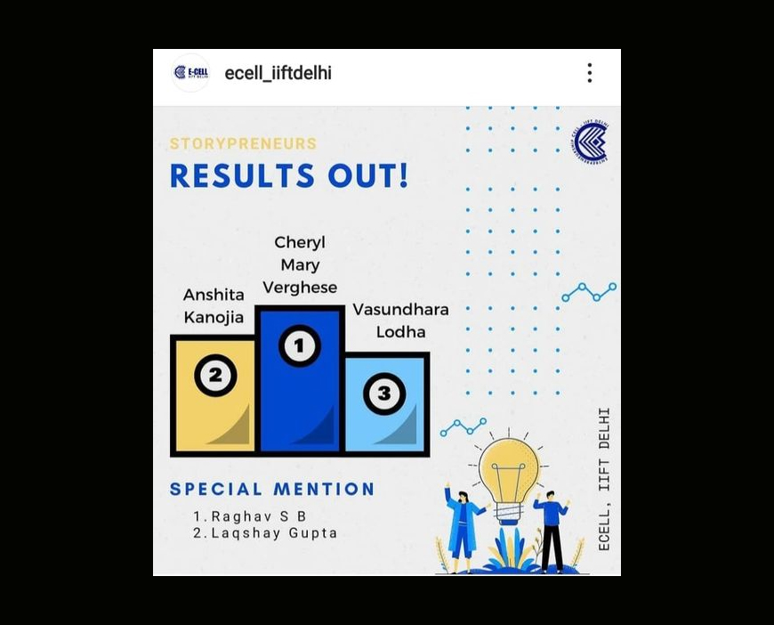 Vasundhara Lodha of MBA 1st Year (2020-22 Batch) has secured 3rd position in the event Story Preneurs organized by the E-Cell of IIFT Delhi on December 28, 2020