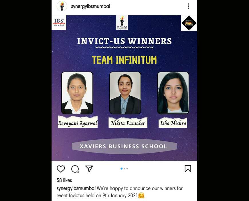 Isha Mishra, Nikita Panicker and Divyani Agarwal of MBA 1st Year (2020-22 Batch) have secured 1st position in the event Invict-us (Best Manager) at Konflux 2021 organised by ICFAI Business School, Mumbai, on 9th January, 2021.