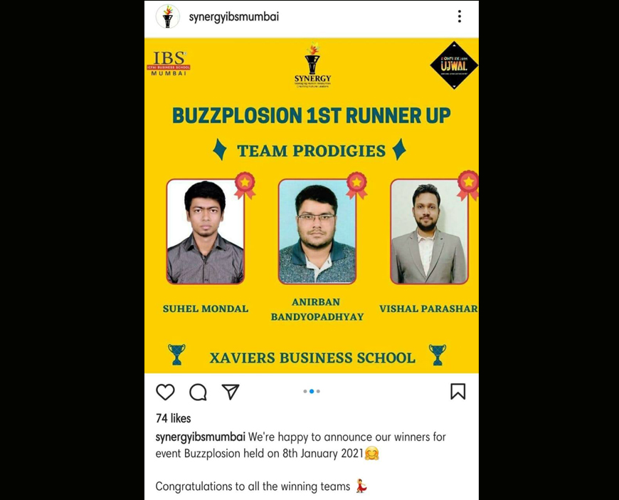 Anirban Bandyopadhyay, Vishal Mohan Parasar and Suhel Ranjan Mondal of MBA 1st Year (2020-22 Batch) have secured 2nd position in the event Buzzplossion at Konflux 2021 organised by ICFAI Business School , Mumbai, on 9th January, 2021.