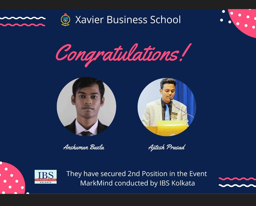 Ajitesh Prasad and Anshuman Baxla of MBA 2nd Year (2019-21 Batch) have secured 2nd position in the event Markmind at BRIO 2021 organised by ICFAI Business School, Kolkata on 17th January, 2021.