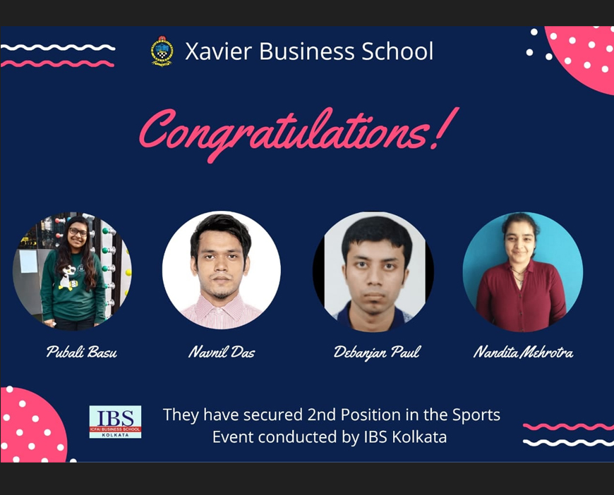 Debanjan Paul, Nandita Mehrotra, Navnil Das, and Pubali Basu of MBA 1st Year (2020-22 Batch) have secured 2nd position in the event Sports Club at BRIO 2021 organised by ICFAI Business School, Kolkata on 17th January, 2021.