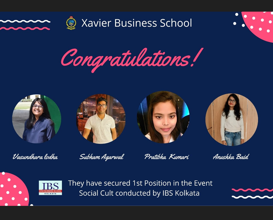 Subham Agarwal, Anushka Baid, Vasundhara Lodha, and Pratibha Kumari of MBA 1st Year (2020-22 Batch) have secured 1st position in the event Social Cult (CSR) at BRIO 2021 organised by ICFAI Business School, Kolkata on 17th January, 2021.