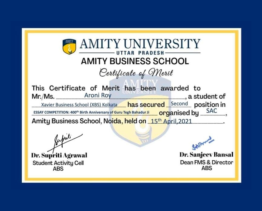 Aroni Roy of MBA 1st Year (2020-22 Batch) has secured 2nd position in the Essay Writing Competition on the 400th Birth Anniversary of Guru Tegh Bahadur Ji organized by Amity Business School, Noida on 15th April 2021.