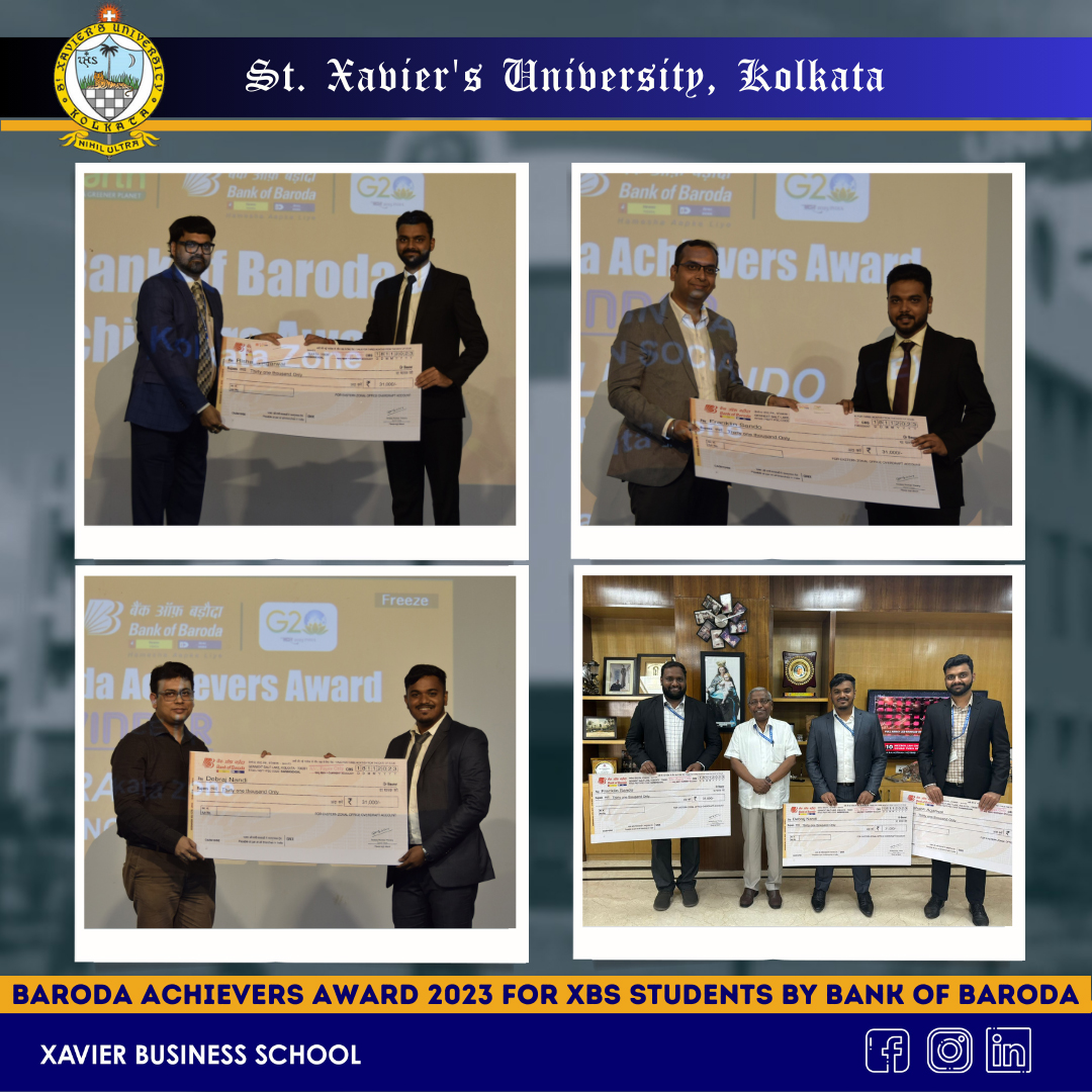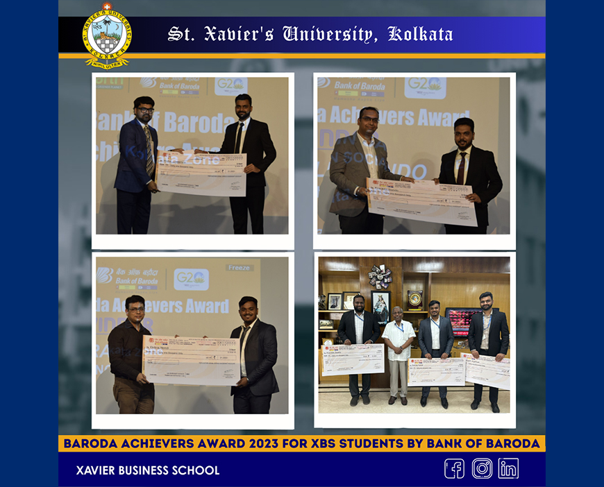 Rishabh Agarwal, Franklin Sando, and Debraj Nandi of MBA 2nd Year (2022-24 Batch) won the Baroda Achievers Award 2023 for Excellence in Academics, Social Work, and Sports respectively.