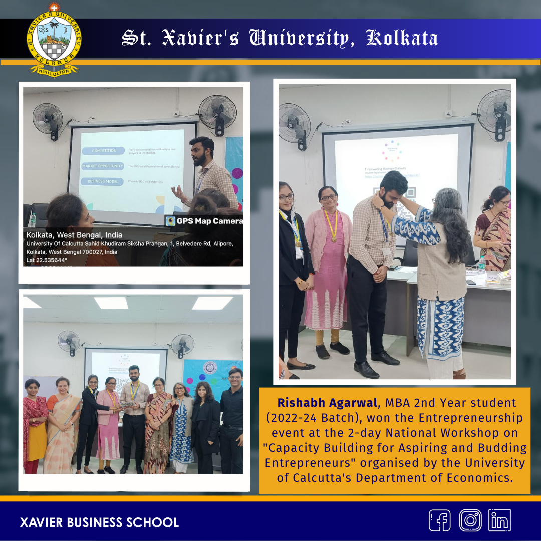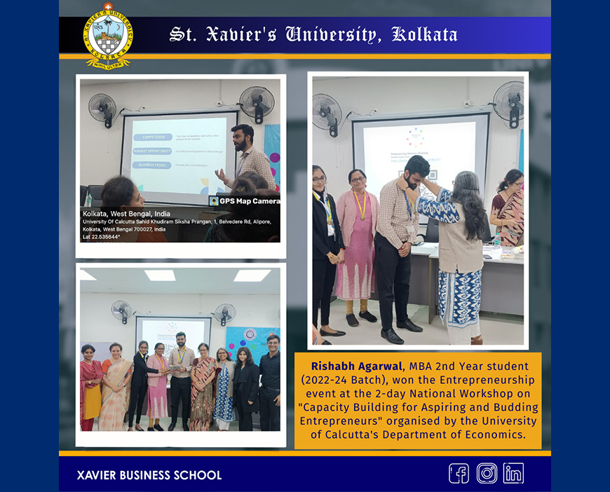 Rishabh Agarwal, MBA 2nd Year student (2022-24 Batch), won the Entrepreneurship event at the 2-day National Workshop on "Capacity Building for Aspiring and Budding Entrepreneurs" organized by the University of Calcutta's Department of Economics.