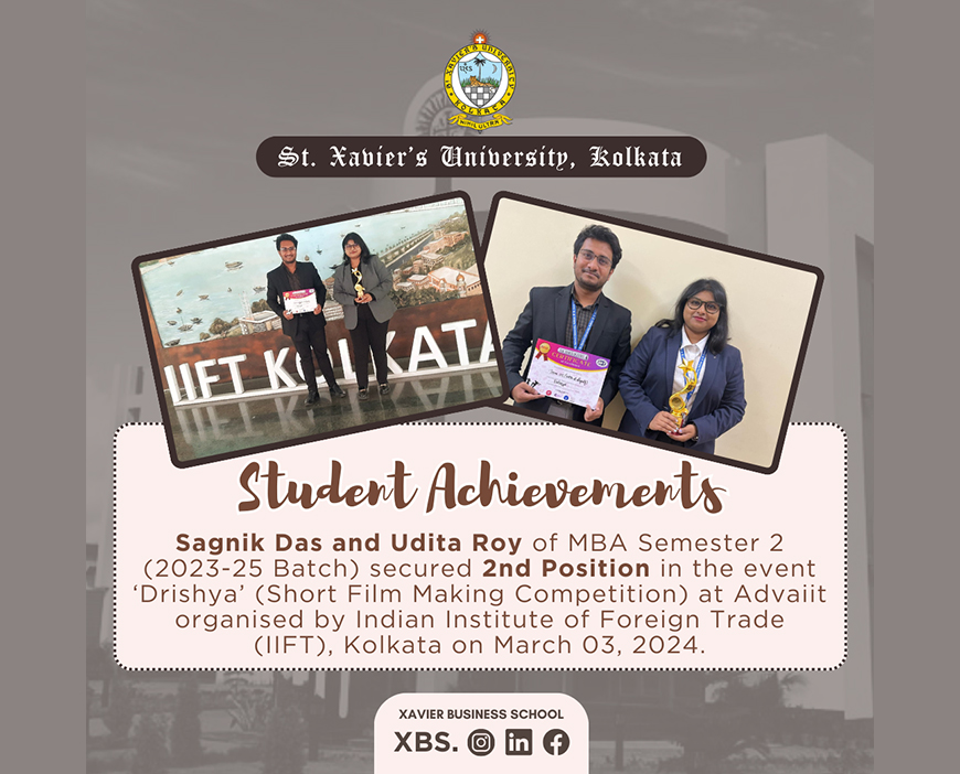 Sagnik Das and Udita Roy of MBA 1st Year (2023-25 Batch) secured 2nd Position in the event 'Drishya' (Short Film Making Competition) at Advaiit organized by Indian Institute of Foreign Trade (IIFT), Kolkata on March 03, 2024.