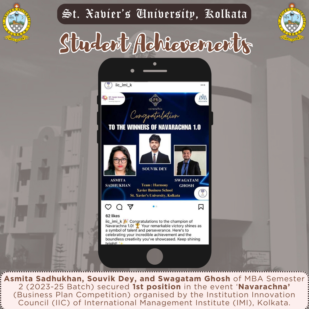 Asmita Sadhukhan, Souvik Dey, and Swagatam Ghosh of MBA 1st Year (2023-25 Batch) secured 1st position in the event 'Navarachna' (Business Plan Competition) organized by International Management Institute (IMI), Kolkata on March 3, 2024.