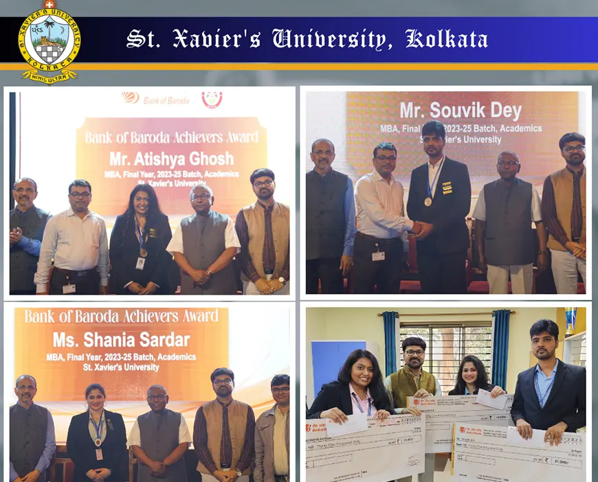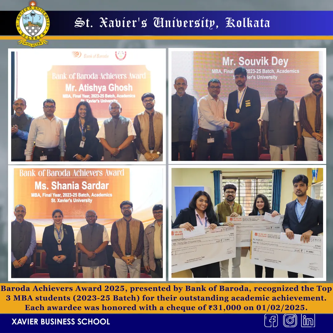 Atishya Ghosh, Souvik Dey, and Shania Sardar of MBA 2nd Year (2023-25 Batch) won the Baroda Achievers Award 2025 for Excellence in Academics.
